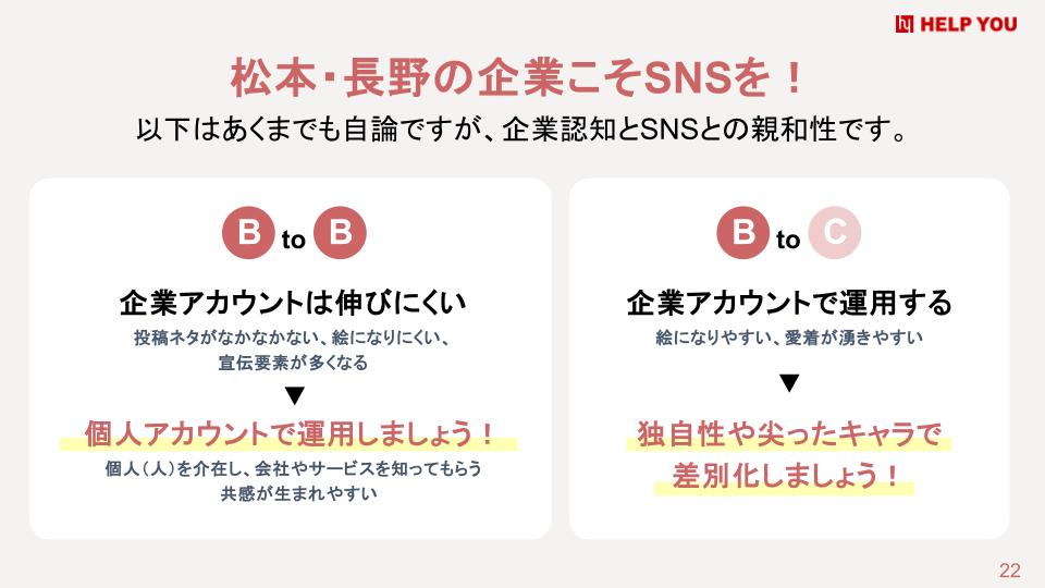 BtoB企業では、個人アカウントでの「顔出し・名前出し・社名出し」による信用度向上が、ビジネスの引き合いと採用応募を増やす鉄則であると紹介されました。