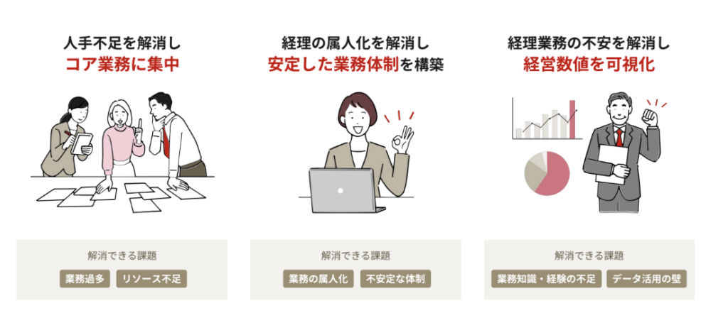急な退職や産休・育休などで経理担当者が不在となった場合でも、単なる引き継ぎ対応ではなく、経理機能そのものを外部で安定的に代替できる点が、通常の経理代行サービスとの大きな違いです。