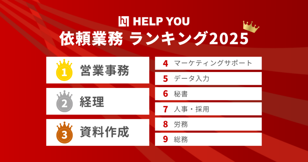 HELP YOUには、バックオフィス業務を中心に、さまざまなご相談が寄せられています。2025年にご依頼いただいた内容のランキングは以下の通りです。