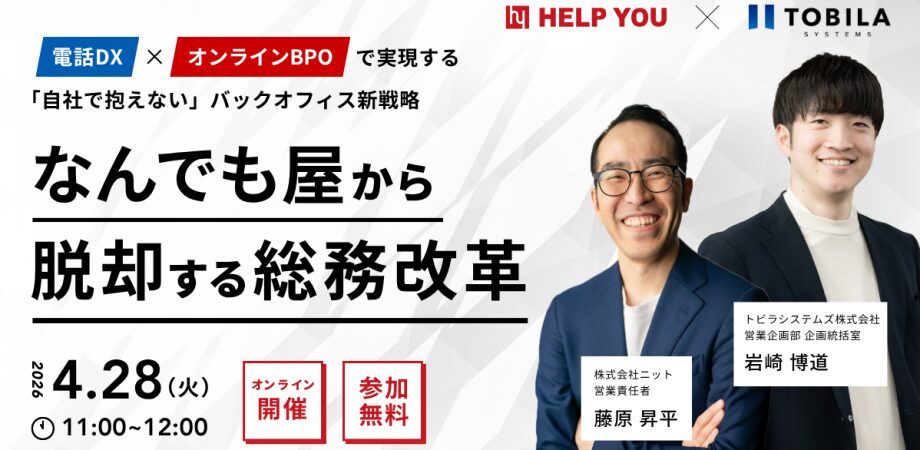このたび、2026年4月28日(火)、トビラシステムズ株式会社(以下、トビラシステムズ)と共催で無料オンラインセミナー『「なんでも屋」から脱却する総務改革 〜電話DX×オンラインBPOで実現する「自社で抱えない」バックオフィス新戦略〜』を開催いたします。